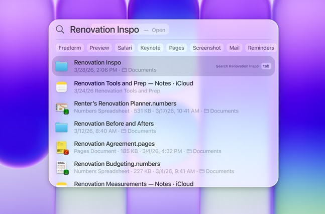 | Actioneaza rapid cu Spotlight Gaseste rapid ceea ce cauti pe MacBook Neo si vezi sugestii din aplicatii, fisiere, actiuni, internet si din Clipboard. |