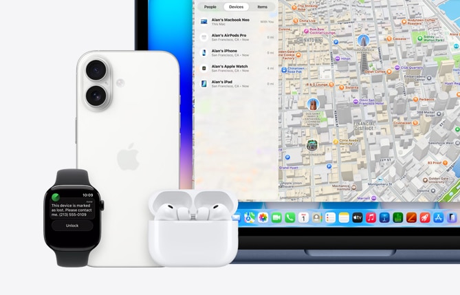| Protectie in caz de pierdere Aplicatia „Find My” te ajuta sa localizezi rapid MacBook Neo si sa il blochezi sau sa ii stergi continutul de la distanta. In plus, FileVault iti cripteaza automat datele, astfel incat acestea sa devina complet ilizibile — datele tale vor ramane in siguranta in cazul in care Mac-ul tau se pierde sau este furat. |