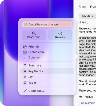 | Instrumente de scriere Verificati-va textul si rescrieti diferite versiuni pana cand tonul si formularea sunt perfecte, apoi rezumati textul selectat cu un singur clic. |