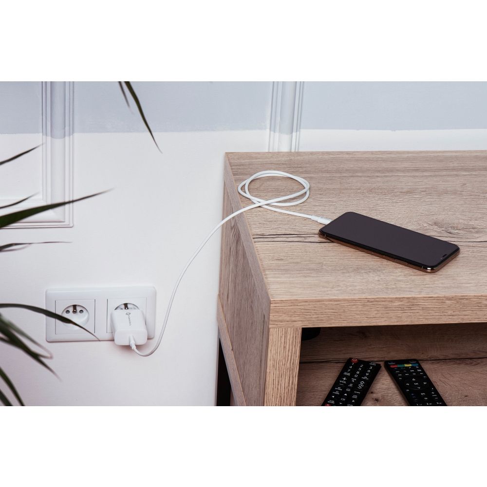 Încărcătorul de priză este prevăzut cu funcții de încărcare rapidă PD și QC 4.0, fiind proiectat pentru cele mai recente dispozitive Apple, precum iPhone 12. Este livrat împreună cu un cablu Lightning.